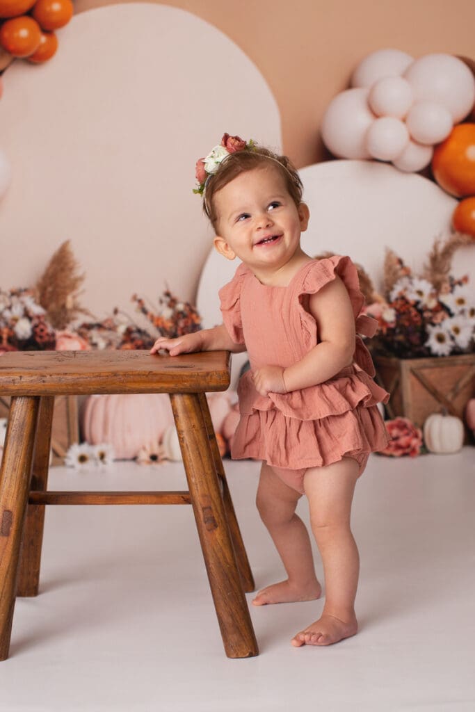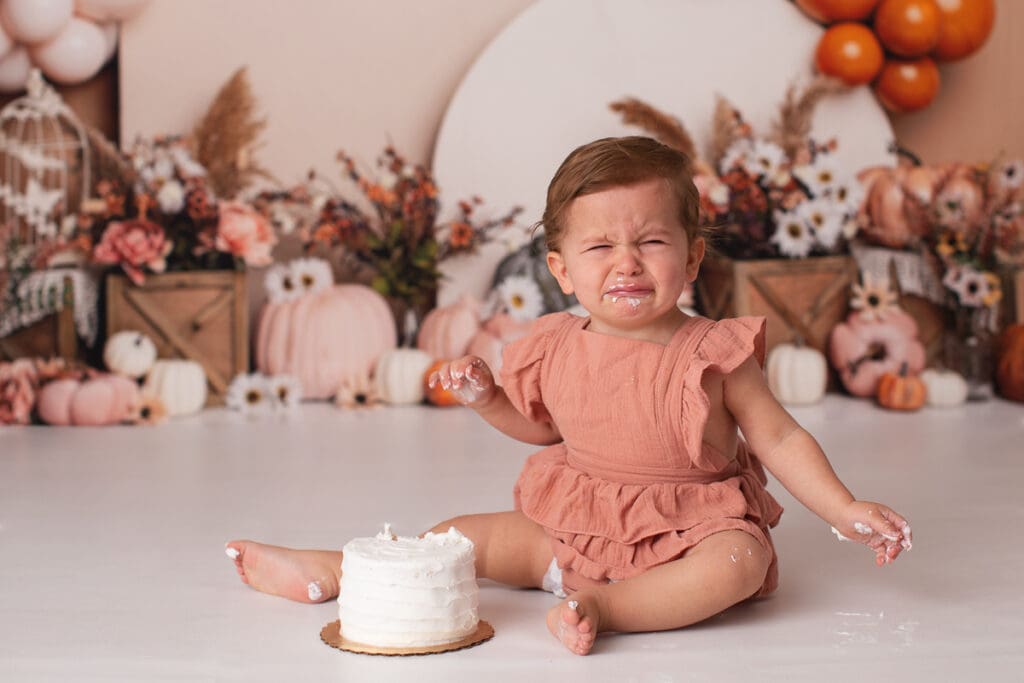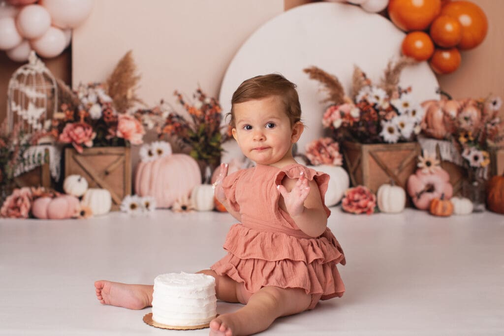 fall backdrop with oranges and tans and pinks with little toddler touching a cake for a cake smash